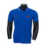 - colore unito BLU con doppio profilo su colletto di colore BIANCO e bottoni di colore BIANCO; patch ricamati con logo e marchio sul davanti su entrambi i lati ad altezza cuore.